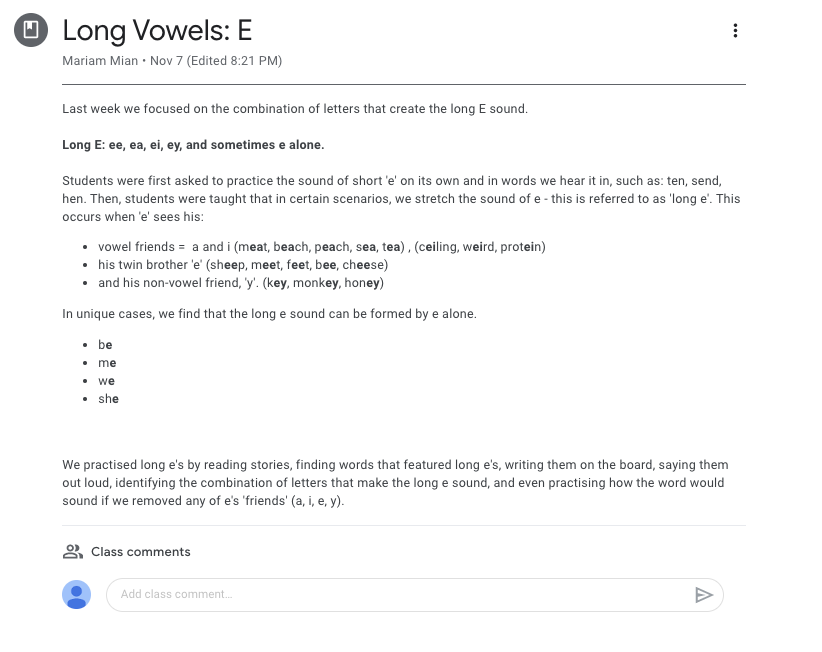 We practised long e's by reading stories, finding words that featured long e's, writing them on the board, saying them out loud, identifying the combination of letters that make the long e sound, and even practising how the word would sound if we removed any of e's 'friends' (a, i, e, y).
